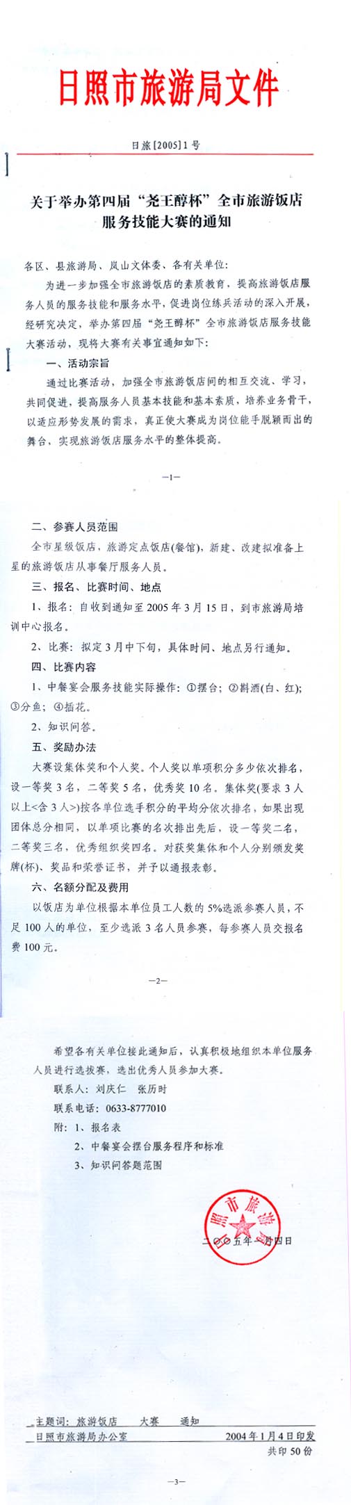 关于举办第四届“尧王醇杯”全市旅游饭店服务技能大赛的通知(2005年01月20日)