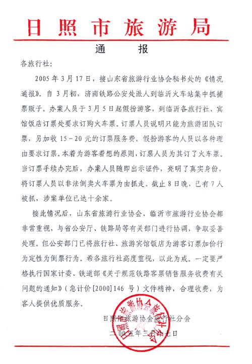 日照市旅游局通报(2005年03月17日)