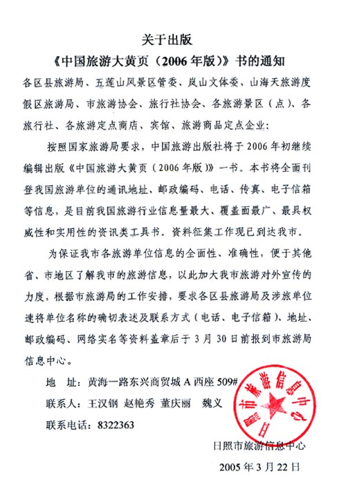 关于出版《中国旅游大黄页(2006年版)》书的通知(2005年03月24日)