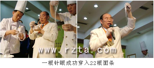 厉恩海先生曾表演过20根拉面同时穿入针眼的绝技,他宣称要在日照这座美丽的港口城市穿入22根,向吉尼斯纪录发起新的冲击。台下的百余名观众凝神屏息……当第22根面条最后穿过针眼时,现场观众顿时报以热烈的掌声。他又顺手点燃了打火机,穿在针孔里的22根拉面眨眼间如纸化灰,让人再次惊叹它细之又细。