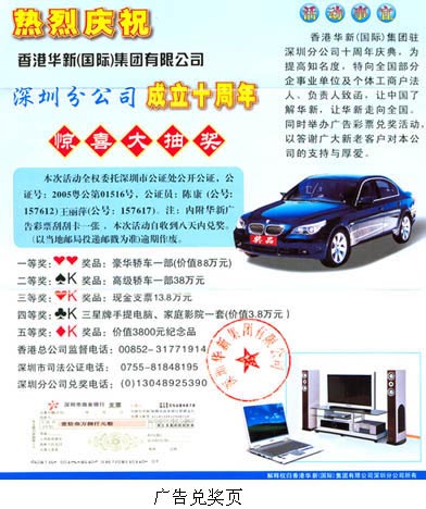 都说“天上不会掉馅饼”,可近日我们偏偏就逢上了“天上掉馅饼”的大运,意外获得了一份大奖,奖金还不少,十三万八! 6月14日一早,日照市互联网协会执行会长田玉峰收到一封来信。这封“香港华新(国际)集团有限公司”寄来的信上说,为庆祝该公司深圳分公司成立十周年,提高知名度,公司特举办广告彩票兑奖活动,以答谢广大新老客户对本公司的支持与厚爱。信上称,本次活动全权委托深圳公证处公开公证。一等奖的奖品为一部价值88万元的豪华轿车,二等奖的奖品为一部价值38万元的高级轿车,三等奖的奖品则为13.8万元现金。宣传单上不仅列出此次活动的“公证号”、“公证员”姓名,还煞有介事地写上“香港总公司监督电话”、“深圳市司法公证电话”。 刮开随信附带的“华新广告彩票刮刮卡”,发现中了三等奖,可获现金支票13.8万元!随之拨通信上的兑奖电话,被告知中了巨奖,缴纳2000元的公证费即可兑奖。因为所谓“中奖信息”的骗局已屡见不鲜,所以持怀疑的态度再次拨通司法公证的电话,得知并不是真正的深圳市公证处电话,而是个人小灵通电话。 因此,这根本就不是天上平白无故掉下的“馅饼”,这里面隐藏的不是阴谋就是陷阱,他是以“公证处”作为幌子,玩收取“公证费”的骗局。 所以,在这里衷心地提醒广大港城市民有所警惕,千万别上当受骗。天上是不会掉馅饼的!