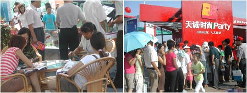 缤纷的氢气球、迎着海风飘展的彩旗,各具特色的展位让入夏以来热闹的金沙滩在今天更透出一种热烈的气氛。熙熙攘攘的人群流连于各个展位之间,寻找自己梦想中的理想好屋。天诚·时尚PARTY在众多的展位中格外引人注目。以大红色为主调的展位和靓丽的楼盘形象在蓝天、碧海、金沙滩的阔大背景中显露出时尚、动感的韵味。悠扬的琴声在海风、海浪还有鸥鸣的伴奏下更加流畅。如潮的人流来到这里,被精致的楼盘模型所吸引,惊叹于现代化的住宅理念。天诚·时尚PARTY作为日照市第一个纯板式小高层自公开发售以来就备受关注,优越的地理位置,完善的配套设施以及高标准的规划设计成为人们关注的焦点。
