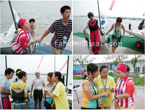 2005国际欧洲级帆船世界锦标赛、世界帆板精英赛将于9月3日正式开始,届时将有来自20多个国家和地区的200多名选手参加。这次是我市首次举办重大国际体育赛事,因此外事接待任务重、要求高,为了更好的做好本次赛事组织工作,在日照市体育局的配合下,由组委会成立了青年志愿者团队,早在3月份的时候就对他们进行了系统的培训,培训内容主要涉及到帆船、帆板赛中的学术用语、外事外交礼仪、外宾的生活习惯及生活中的禁忌习俗等。从目前志愿者的质量来看本次志愿者已具备一定的外语水平和外事礼仪知识,相信他们一定能够成为本次国际大型赛事提供有效优质的服务。 志愿者对于世帆赛的成功举办有着极其重要的帮助作用,他们是让世界了解中国、了解山东、了解日照的窗口。赛前这几天志愿者们帮助运动员们下水,用熟练的外语充当翻译告诉运动员们吃饭、集合的地点,前后奔波累得汗流浃背,得到了组委会、教练员、运动员的一致好评。青年志愿者已成为雷锋精神在新时代的继承人,志愿者活动也使大学生们从象牙塔走进社会,把自己学到的书本知识运用于社会实践中,他们不计报酬,不辞辛苦,服务社会,奉献爱心,充分体现了“团结,友爱,文明,进步”的宗旨,也展现了当代大学生的青春风貌!