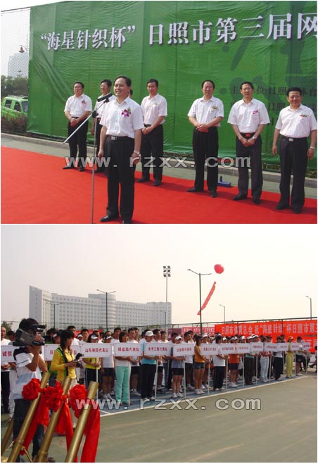 6月16日下午,海星针织网球场内人头攒动,欢歌阵阵,“海星针织杯”市第三届网球大赛在这里开赛。市委副书记、市网球协会名誉主席徐学武出席开幕式并宣布比赛开始。市人大常委会副主任梁云爱,副市长解世增,市政协副主席傅瑞荣等领导和相关部门负责同志出席大赛开幕式。赛前,徐学武与解世增共同为海星针织网球场的启用揭牌。 本次大赛由市体育局、市体育总会主办,市网球协会承办,海星针织服装有限公司协办。来自市内各有关部门、企事业单位、学校、社会团体、国家与省驻日照单位的网球爱好者组成15支代表队,将在16至18日期间进行激烈角逐。