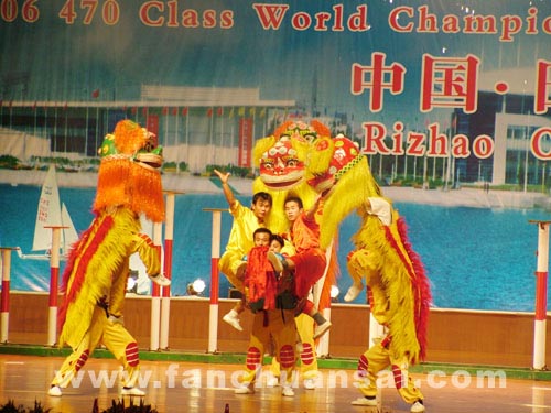 9月6日晚的港城,海风送爽,万众欢腾。“长城游艇杯”2006年470级帆船世界锦标赛开幕式及文艺演出在日照市会展中心隆重举行。精彩的文艺节目赢得观众阵阵掌声。 伴随着欢乐的乐曲,在470级帆船世界锦标赛的巨幅蓝色背景下,富于中国特色的舞狮表演充分把中国传统文化之美展示给了各国运动员和官员——文艺演出由此拉开序幕。杂技《顶碗》、《绸吊》、《博—倒立技巧》、《磴人空竹》等精彩的表演紧紧抓住了观众的心。《蹬人空竹》再次让全场掌声雷动,特别是空翻两周接住空竹、蹬人空竹接力等项目,让观众深深陶醉在柔与美的视觉体验中。外国嘉宾和运动员们纷纷拿出相机,记录这一难得的瞬间。接着,《飞旋草帽》、《穿越地圈》、《雏凤临空——车技》等精彩节目陆续登场。 在五彩灯光里,两位外国学员上场表演了杂技小品《快乐的炊事员》,滑稽精彩地演出赢得了观众的掌声和欢呼声。《雏凤临空——车技》精彩的车技表演以惊人的动作、美丽的造型再次赢得了国内外观众热烈的掌声。台前五彩斑斓的烟花把舞台映衬分外美丽。 晚会节目以中国传统杂技为核心,精彩表演与演员形体技巧完美结合,同时配以先进的声、光、电技术的结合,吴桥杂技显露出的“中国魅力”,他们不愧是龙的传人、吴桥杂技的子孙,他们用其柔美、刚劲、欢快去全释东方传统艺术。