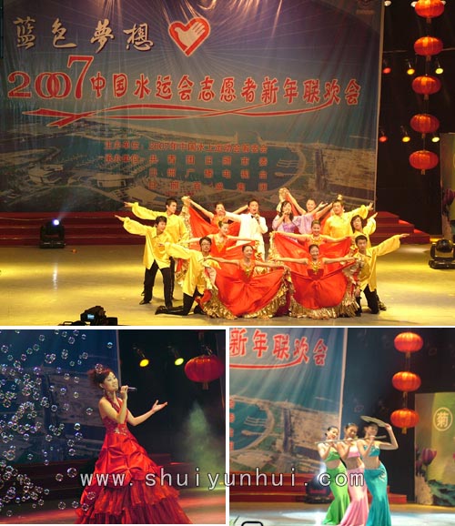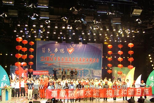 2007年中国水上运动会筹委会、团市委、日照广播电视台以及日照百盛集团精心策划了这台晚会。来自日照职业技术学院、日照广播电视大学、曲阜师范大学、山东外国语职业学院、山东体育学院、山东水利职业学院、济宁医学院的师生们为晚会献上了精彩纷呈的节目。联欢会在喜庆、欢快的歌伴舞《好运来》中拉开序幕。在一个多小时的演出中,民乐合奏《赛马》、舞蹈《邵多丽》、快板《爱心赞》、搏击操《动感搏击》、萨克斯独奏《海之梦》、歌伴舞《大地飞歌》等18个节目,内容丰富精彩。联欢会在情景剧《青年志愿者之歌》中圆满落幕。