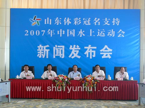 8月25日,“山东体彩杯”2007年中国水上运动会总冠名单位新闻发布会举行。水运会组委会副主任兼秘书长、日照市副市长解世增,国家体育总局水上运动管理中心奥运保障部主任刘建勇、山东省体育彩票管理中心主任蒋强,水运会组委会副秘书长兼资源开发部部长、日照市体育局局长赵文胜出席会议。各新闻媒体和有关方面代表应邀参加发布会。发布会由日照市体育局副局长丁明春主持。