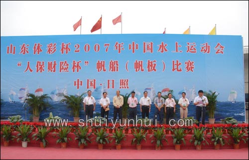 8月30日上午,2007年中国水上运动会“人保财险杯”帆船帆板比赛开幕式在日照世帆赛基地举行。国家体育总局水上运动管理中心副主任李全海,国家体育总局水上运动管理中心一部部长姚新培、副部长周长城出席开幕式。姚新培致开幕词,日照市体育局副局长、纪检组长王子亮主持开幕式。 姚新培说,日照风景秀丽,气候宜人,拥有“蓝天、碧海、金沙滩”得天独厚的环境优势,是开展各类水上运动的理想之地,被国家体育总局命名为国家水上运动训练基地。本次水运会帆船帆板比赛的举行,必将为我国帆船帆板运动优秀选手切磋技艺、增进交流搭建一个新的平台,为进一步提高我国帆船帆板运动的战术水平,为备战2008年奥运会发挥重要作用。 据介绍,参加本次比赛的是来自江苏、广东、浙江、上海、北京、海南、福建等省市16支代表队的480名运动员。