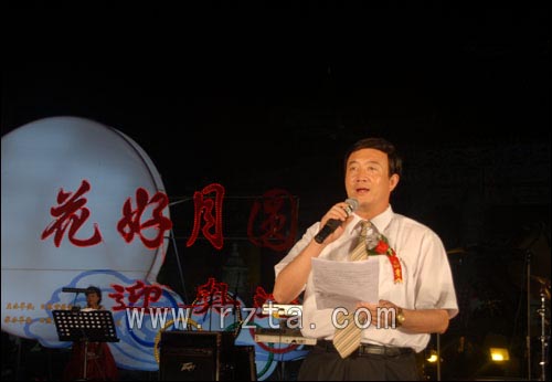 日照市人大副主任张玉佩、孙承金,市政协副主席王和田,市人大原副主任单联云、李连成、肖开富,市政协原副主席丁原胜、张培宏,市旅游局局长王立新,岚山区委副书记王泽光,岚山区人大副主任胡善军,岚山区政府副区长张峰,东港区政府副区长姜毅,岚山区政协副主席韩建设,日照港集团副总经理、岚山港分公司总经理尚金瑞,黄海九寨沟风景区董事长王志和等出席晚会,并为中华五环第一大月饼揭幕。王立新致开幕词。