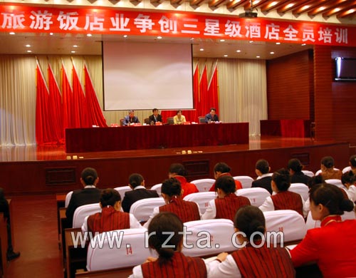 赵志超副局长在讲话中说,近年来,莒县县委县政府大力发展旅游业,开发浮来山等风景区,连续举办“福寿文化节”等系列活动,使游客不断增加。莒县为满足接待游客的需要,加大了餐饮业的发展,先后有三家酒店被评为三星级酒店。这就要求旅游酒店要在管理水平、软硬件设施上不断提高,要高度重视培训工作,认识到评选星级酒店无论是对酒店还是每一位员工都是一种机遇和挑战。希望大家认真学习、认真思考,内强素质、外塑形象,不断提高服务的质量和水平,更好地为旅游业的发展服务。