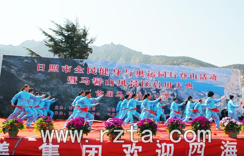 日照市全民健身与奥运同行登山活动暨马髫山风景区启用庆典活动的举办,是一次体育与旅游的完美结合,也由此拉开了2008年日照市“全民健身与奥运同行”活动的序幕。启动仪式上《太极功夫扇》等全市精品全民健身项目进行了展演。