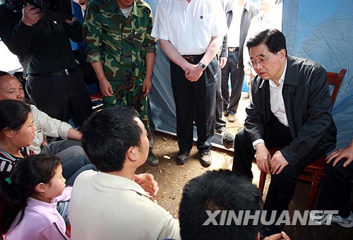 5月16日下午,中共中央总书记、国家主席、中央军委主席胡锦涛在受地震灾害严重的四川省绵阳市北川县擂鼓镇胜利村看望受灾群众。 新华社记者鞠鹏摄