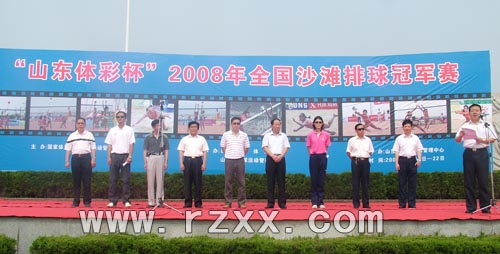 6月19日9:00,“山东体彩杯”2008年全国沙滩排球冠军赛在日照万平口海滨生态公园举行开幕式。 国家体育总局排球管理运动中心沙排部副主任向前,日照市副市长解世增,日照市政协主席林玉莹,山东体育局排球运动管理中心主任韩晓华,第十一界全运会组委会场馆部副部长葛承起,山东体育局综合业务处副处长谈文新,裁判委员会主任翟成竹,日照市政府副秘书长来永明,技术代表程兆赫,出席了开幕式。组委会各部室负责人、全体运动员、教练员、领队和裁判员参加开幕式。 开幕式前,全体人员向四川大地震遇难人员默哀1分钟。日照市体育局局长赵文胜主持开幕式,国家体育总局排球运动管理中心沙排部副主任向前在开幕式上致辞,副市长解世增宣布比赛开幕。 向前在致辞中说,近年来,日照市先后四次成功承办了全国沙滩排球冠军赛、巡回赛,得到了广泛认可和一致好评。2006年11月22日,日照市被命名为“全国沙滩排休训练基地”,进一步证明了日照完全具备了服务高水平沙滩排球训练和比赛的条件和能力,日照必将成为全国沙滩排球训练比赛的大本营。“蓝天、碧海、金沙滩” 与沙滩排球运功的完美融合,已构成日照海滨休闲度假游的一道靓丽风景,成为日照打造“水上运动之都”的新亮点。 本次比赛由国家体育总局排球运动管理中心主办,日照市市体育局山东省排球运动管理中心承办。来自全国的33支男队和36支女队的运动员和裁判员、官员和大会工作人员近300人将参加本次比赛。本次比赛为期4天,将于6月22日结束。
