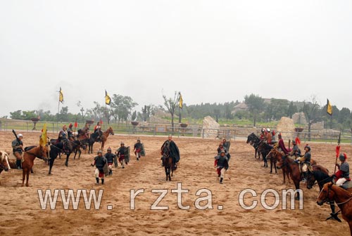 跑马场是崮顶上最宽敞的地方,也是当年纪王操练士兵的场所。如今,在这里每天都有 “纪王点兵”的马战表演,再现了当年纪王厉兵秣马,苦练精兵,力图东山再起的场景。演武场上战马奔腾,杀声阵阵,再现了一幅纪国将士征战疆场的壮丽画卷,让人如同身临其境。亲身体验一下披挂上阵,征战疆场的感觉,是每个到这里看过马战表演的游客心中抑制不住的冲动。