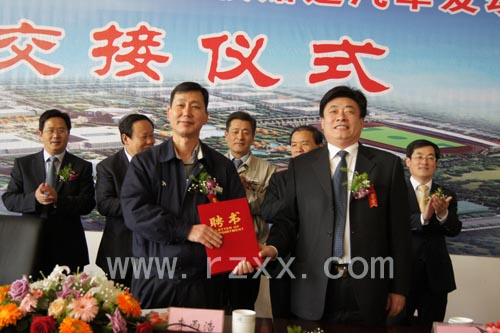仪式上,日照高级技工学校校长刘磊与现代威亚汽车发动机(山东)有限公司李丙浩先生交换牌证并签署校企合作协议。