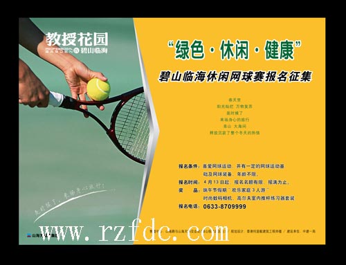 “一年之际在于春”。在这个万物复苏的季节,身体和灵魂总要有一个在路上,那您选择什么样的方式来放松身心呢?是选择户外踏春,还是和家人放放风筝呢?春天不锻炼,四季不舒坦。教授花园.碧山临海邀您一起打网球,赢大奖喽。 报名条件:喜爱网球运动,并有一定的网球基础和网球设备,年龄不限哦。 报名时间:4月13日起,名额截满为止。 心动大奖:端午节假期“欢乐家庭三日游”;时尚数码相机;高尔夫室内推杆练习器 套装 报名电话:0633——8709999 不在沉默中灭亡,要在沉默中爆发。春光灿烂,给身心一场旅行,蓝天碧海间,释放整个冬季沉寂的热情。