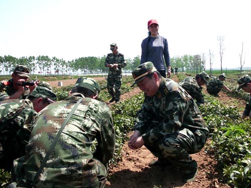 休息时间,官兵们还与碧波茶业公司员工进行了互动交流,并即兴表演了节目,官兵们精神抖擞齐唱军歌,充分展示出军营官兵飒爽英姿;碧波茶业公司员工以一段山东快书《碧波绿茶美名传》博得现场阵阵喝彩,通过一天的共同劳动与交流,加深了军民之间的感情,增进了友谊。营造出军爱民、民拥军,军民共建一家亲的氛围。