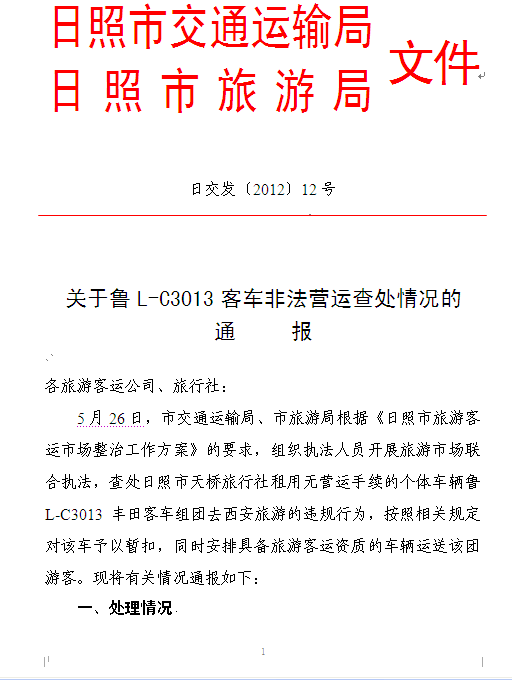 关于鲁L-C3013客车非法营运查处情况的通报(2012年06月26日)