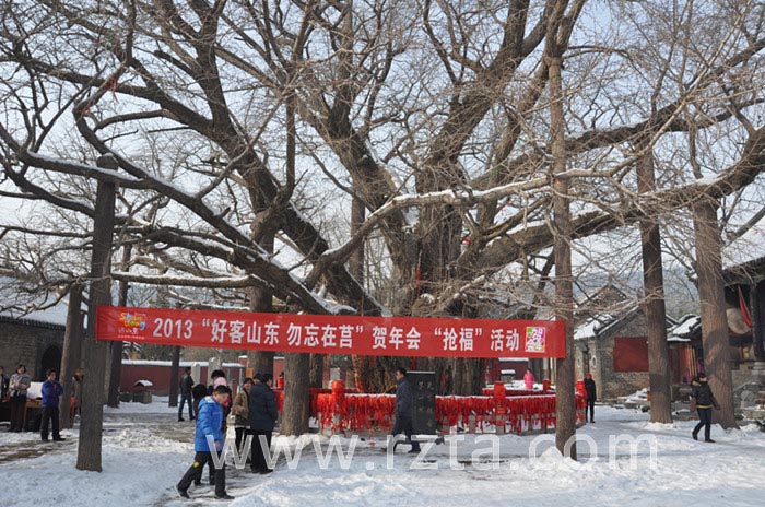 2013年“好客山东贺年会”是在全省上下认真学习贯彻落实党的十八大和省委十届二次全委会精神,全面建成小康社会新的征程上举办的重大文化旅游节事活动。莒县旅游局充分认识新形势下举办贺年会活动的重大意义,以“空谈误国、实干兴邦”的精神状态,早准备、早策划、早落实,按照“领导更重视、组织更有效、发动更深入、优惠更实际、成果更突出”的总要求,坚持“政府主导、部门联动、市场运作、社会参与”的原则,全力打造莒县“贺年会”文化品牌。 莒县将依托“好客山东”文化旅游品牌,围绕元旦、春节、元宵节三大节点,以“跨年迎新”、“春节祈福”、“元宵狂欢”为主题,以突出“年味”为核心,推出具有地方特色的“贺年乐”、“贺年福”、 “贺年宴”、“贺年游”、“贺年礼”五大系列产品,使年味更浓、消费更旺,进一步扩大淡季旅游消费,繁荣冬季旅游市场。 2013年元月1日,浮来山风景区依托四千年“银杏树王”和“福来山”之美誉,举行了的“送福”、“抢福”活动,为游客送上了一道精美的节日大餐。在‘ 抢福’游戏中我们制作了特大号骰子(50cm×50cm),分别带有“福”“禄”“寿”“喜”“财”“安”,根据参与者掷出的字面不同设置奖项,凡参与者皆有奖品。 另景区还为广大游客准备了精美的“福”字和台历。虽然天气寒冷,但游客们热情高涨,到处洋溢着节日的喜悦。