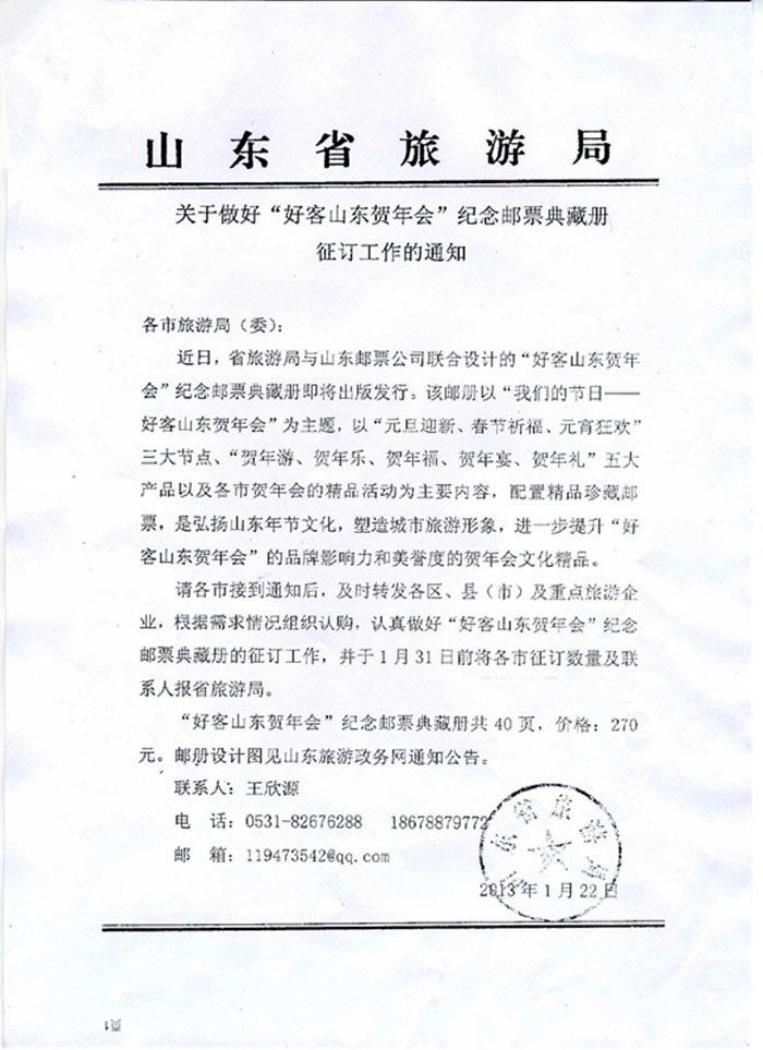 附:山东省旅游局《关于做好“好客山东贺年会”纪念邮票典藏册征订工作的通知》