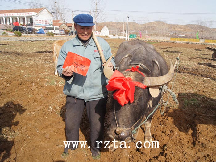 牛角拴红布,牛头戴上大红花,十组耕牛,统一佩戴号牌后一字排开。“预备…开始!”,赛令一发,牛儿们一个个庞大的身躯矫健地向前冲去,抖擞精神,仿佛憋了一冬的劲终于有地儿使了,“耕牛闹春”这就开始了。