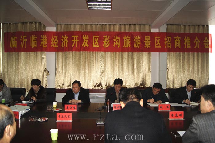 3.17日, 莒南临港经济开发区朱芦镇彩沟风景区招商推介会召开。临港经济开发区党工委委员、管委会副主任陈之军,临港经济开发区旅游局局长王富增参会。日照市旅游局副局长赵志超应邀出席会议。来自日照、临沂等地的数十家投资商和景区、旅行社参加会议。