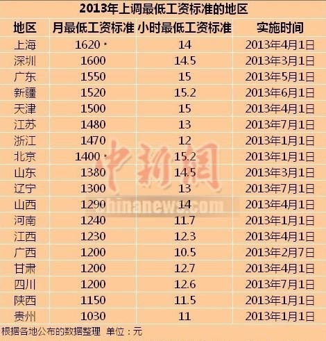 今年18省市上调最低工资标准 山东1380元居第九位(2013年07月01日)