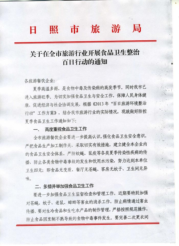 关于在全市旅游行业开展食品卫生整治百日行动的通知(2013年07月08日)