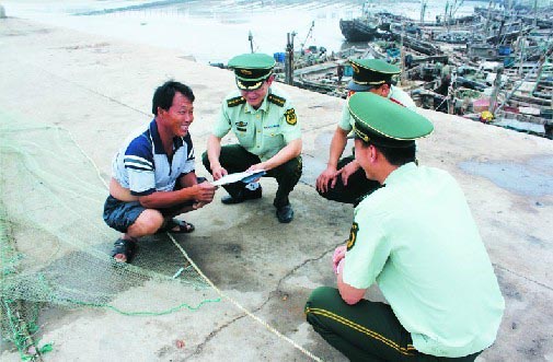 7月14日,任家台边防派出所民警正在给渔民们讲述防范台风“苏力”的注意事项。 历年台风危害较大,给群众造成较大损失,根据往年相关经验,台风“苏力”到来之前,任家台边防派出所组织民警,到住户家中,向群众介绍台风形成原因、风力级数、易造成危害,规劝群众高度重视防范台风工作;在码头,帮助群众停靠渔船,向渔民深入讲解台风危害,做到防患于未然。