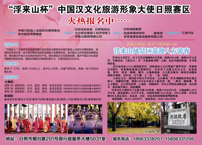 活动介绍: “汉韵佳人”中国汉文化旅游形象大使全国总决赛是由中国汉韵佳人全国总决赛组委会、淮海经济区核心区一体化城市媒体发起的全国性大型赛事活动,是中国本土的顶级旅游赛事品牌,意在整合开发汉文化旅游资源与产品,联合塑造汉文化旅游品牌,提升中国汉文化旅游同盟城市的知名度,增强当地景区对游客的吸引力,丰富百姓的文化生活。 赛事宗旨: 大赛以“汉风、汉韵、中国美、中国魂”为主题,以“弘扬汉魂,促进旅游”为宗旨,挖掘汉文化之美,传播中国汉文化旅游同盟城市品牌形象,塑造新世界中国汉文化旅游同盟城市新形象,让世界了解汉文化,让中国汉文化旅游同盟城市走向世界。 举办时间: 日照赛区比赛:2013年7月至9月 全国总决赛:2013年10月 报名条件: 要求17-27岁、身高163cm以上、高中以上学历、形象气质较佳、具备一定才艺的未婚女性。 评选方式: 本次比赛将通过海选、初赛、复赛、决赛四个部分,评选出日照赛区冠、亚、季军及各单项奖选手并给予一定的物质奖励。日照赛区前三名选手将直接参加全国总决赛。 报名电话: 15806331206(张女士)18663338207(郑女士) 报名地址: 日照市烟台路201号原行政服务大楼5031室