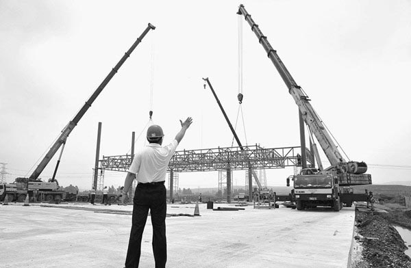 7月30日,施工人员在日兰高速日照段龙山收费站雨棚吊装现场施工。记者从市公路局获悉,日兰高速日照段龙山互通立交收费站雨棚吊装完毕,为收费站的机电施工创造了良好的施工条件。截至目前,日兰高速日照段龙山互通立交工程已完成土石方浇筑工程量的90%,跨线桥现浇箱梁浇筑已基本完成,整个工程将于10月1日全面竣工。