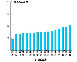 7月份,细颗粒物浓度最好的城市是烟台,为42μg/m3,最差的城市是德州,为85μg/m3。