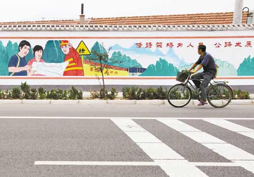 9月4日,204国道日照市河山镇段,一名村民骑车经过公路文化墙。 近年来,日照市公路管理局大力实施“文化公路”建设,通过修建文化墙、设置景观石等公路美化新举措,把公路沿线挡土墙的“闷”转变成了美,营造了动感氛围,营造了“路、车、人、景”的和谐画面,提升了路域环境水平和文化品位。