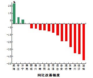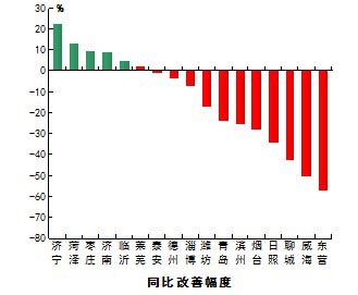 8月份,可吸入颗粒物浓度最好的城市是威海,为63μg/m3,最差的城市是聊城,为154μg/m3;同比改善幅度最大的城市是济宁,为22%,恶化幅度最大的城市是东营,为-56.8%。