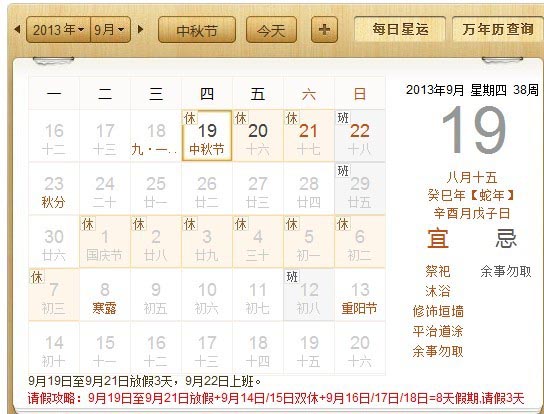 攻略一:中秋节请3天休8天:今年中秋节假期为9月19-21日,这一周的前3天(即9月16-18日)请假,加上上个双休日两天,即可享受9月14-21日的8天长假。