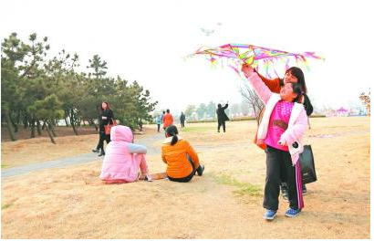 3月15日,日照银河公园,小朋友和妈妈一起放风筝。 连日来,随着气温的持续回升,市民纷纷走到户外,或踏青赏景,或与孩子放风筝,一同感受春天的气息。