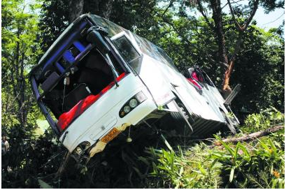 这是3月25日在泰国普吉岛事故现场拍摄的事故车辆。 一辆载有20名中国游客的旅游大巴25日在普吉岛发生车祸,导致3名中国游客死亡,其余10多人受重伤。事发时,旅游大巴正经由帕塔克路前往普吉岛西海岸著名的芭东景点,途中不慎坠入山崖。