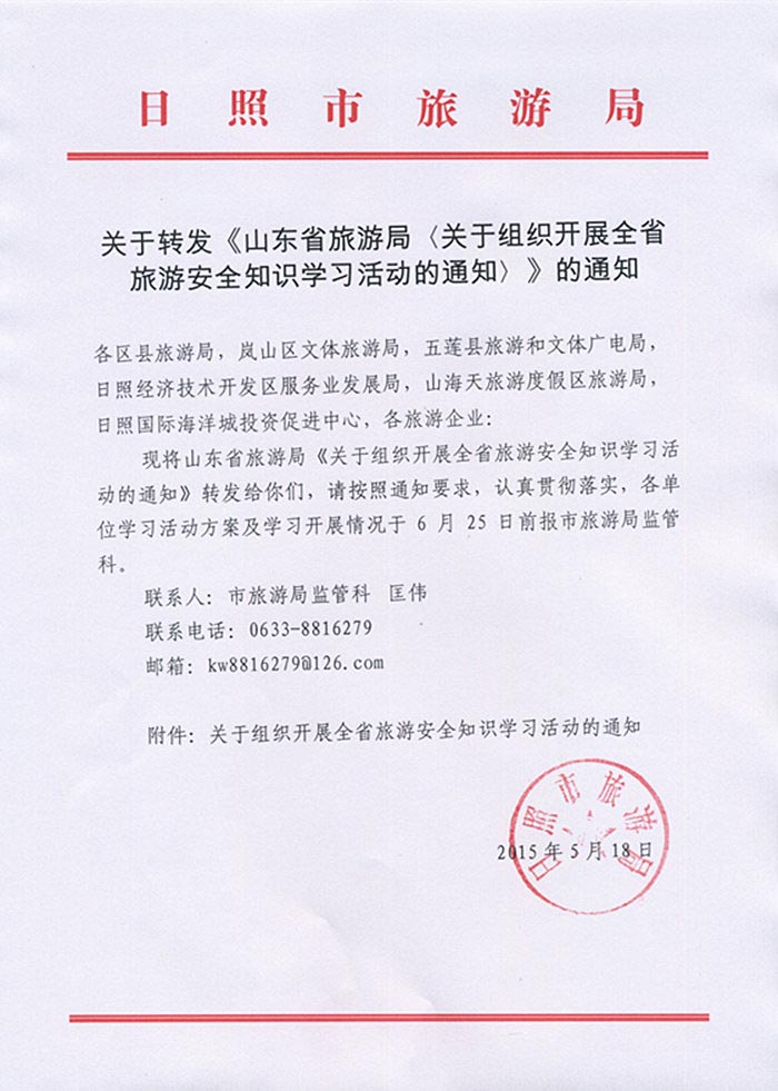 关于转发《山东省旅游局<关于组织开展全省旅游安全知识学习活动的通知>》的通知(2015年05月18日)