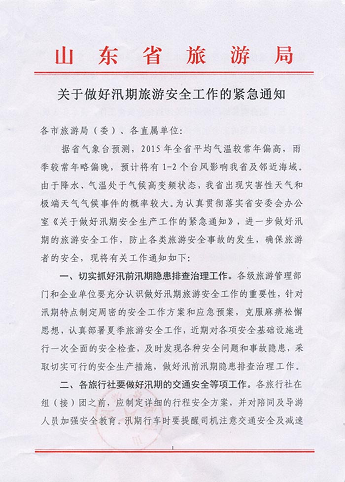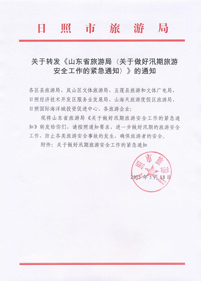 关于转发《山东省旅游局<关于做好汛期旅游安全工作的紧急通知>》的通知(2015年05月18日)