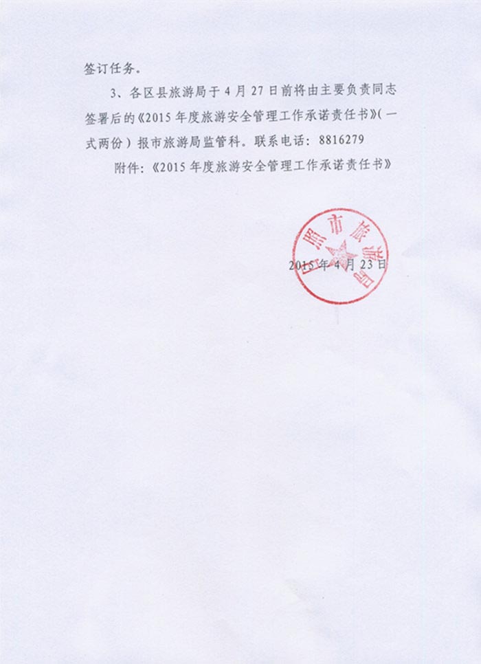关于做好2015年度旅游安全责任书签订工作的通知(2015年04月23日)