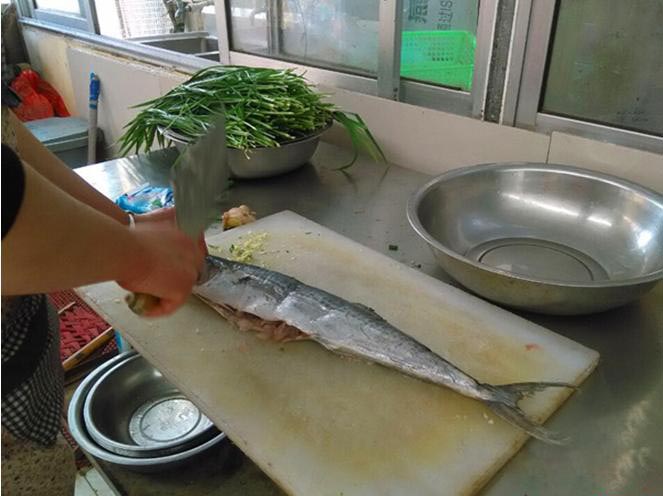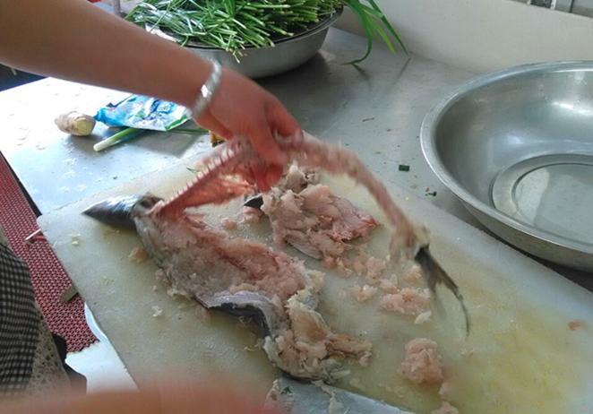 “骨肉分离”,将鲅鱼的鱼骨、鱼刺、鱼皮剔除。