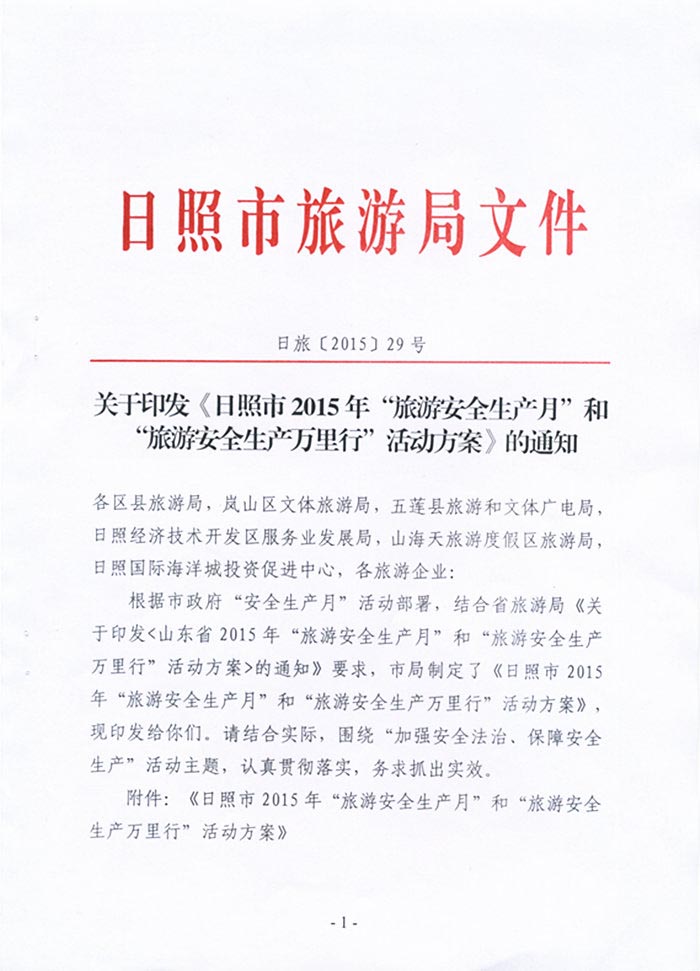 关于印发《日照市2015年“旅游安全生产月”和“旅游生产安全万里行”活动方案》的通知(2015年06月05日)