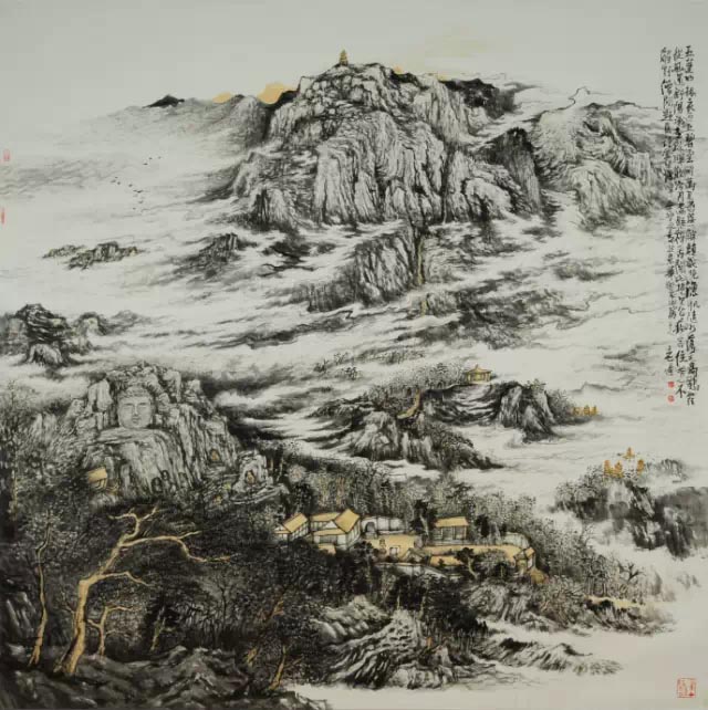 海嵎有福地,东夷九仙山。天生五朵峰,其状若圣莲。 宋熙宁年间大文豪苏轼知密洲府,曾诗“奇秀不减雁荡”“九仙今已压京东”赞五莲和九仙两山。清朝侍读大学士翁正春将五莲山与泰山、崂山相提并论:“岱以崇隆显,崂以幽窅显,莲以峭削显”,称赞二山“真齐鲁间最胜地也”。 望海仙山,水墨五莲。让我们一同感受下水墨意境中的五莲山、九仙山别样之美吧。 迟昭方 《五莲山图》 姚向东《五莲山之秘》 于健伯《情侣峰》