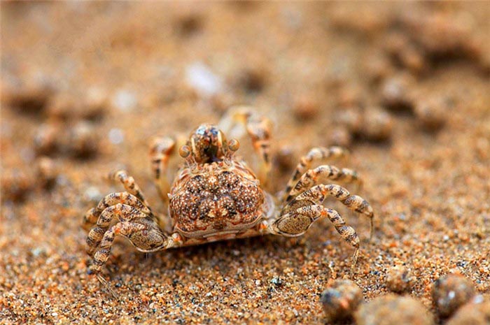 金色的沙滩上,小螃蟹的房子就建在海水清洗过的湿地上,它们轻轻的探出头、偷偷的看向这群在沙滩嬉戏的人儿。