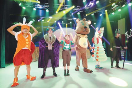 7月4日,身穿道具服装的演员们正在舞台上表演儿童剧。 当日,由市区内首家儿童剧场日照水知影剧中心原创的儿童剧《艾瑞克的奇幻冒险》首次与观众见面,色彩丰富的舞台布景灯光、优美的音乐从视觉、听觉上为孩子们呈现出一个炫丽魔幻的卡通王国,现场近300名小朋友在家长的带领下共同沉浸在童话世界的美妙与奇幻中。