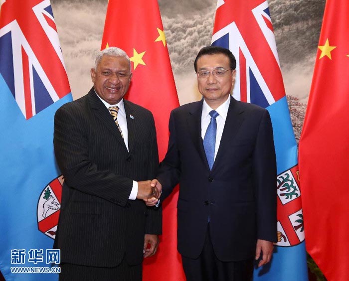 国务院总理李克强16日下午在人民大会堂同斐济总理姆拜尼马拉马举行会谈。