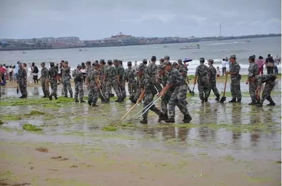 官兵们弯着腰,挥汗如雨,沿着海岸线,用军铲、用盆甚至有的用手一点一点地从沙子里抠出埋在里面的浒苔。为辛勤的军人和工作人员点赞!!