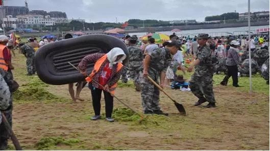 7月20日下午三点,71345部队组织官兵前往受浒苔影响的阳光海岸景区,帮助阳光海岸旅游管理中心工作人员清理浒苔。