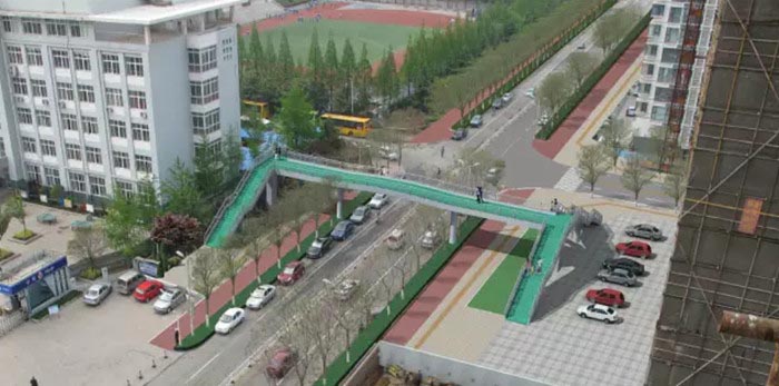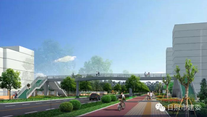 【威海路人行过街天桥鸟瞰图】 7月24日,威海路人行过街天桥工程正式开工建设。 据了解,威海路人行过街天桥位于市区威海路与胶州路交汇处南侧,为钢结构人行天桥,桥底净空高4.7米,桥长43米,主桥面宽4.5米,为双侧人行梯道,天桥主梁和人行梯道为连续钢箱梁,下部结构为钢筋混凝土结构。项目计划10月中旬完工。 威海路人行过街天桥为市政府2015城建计划确定的城市交通安全设施完善工程,项目的实施将有效改善威海路新营小学区域交通出行环境,更好地保障小学生的出行安全。