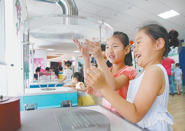 7月28日,小朋友们正在日照少年宫体验互动式科普展品。 日照市流动科技馆2015科普教育巡展于6月1日至10月31日在日照少年宫举办。还将举行科普演示项目、科学体验项目等活动。 巡展针对青少年学生的特点,结合地域特色和科普工作实际,通过开展丰富多彩的科普展示、科技艺术教育体验等活动,激发青少年对科学技术的学习兴趣,启迪创新智慧,提升青少年的科学素质和技能。活动期间将向观众展示互动式科普展品50余件。